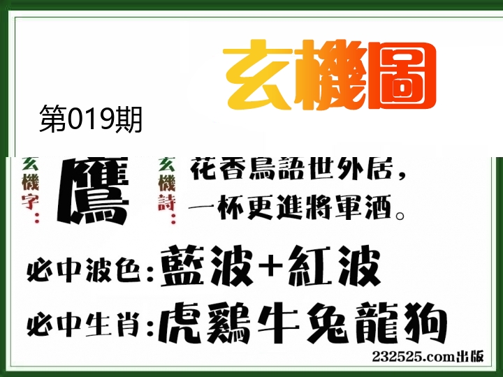 | 019期: ⑨肖 | 马鸡猴兔鼠狗牛蛇羊 | ????中 |