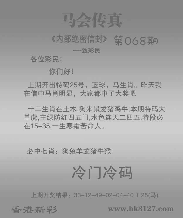 | 067期: ⑦肖 | 猴羊兔虎狗鼠马 | 马25中 |